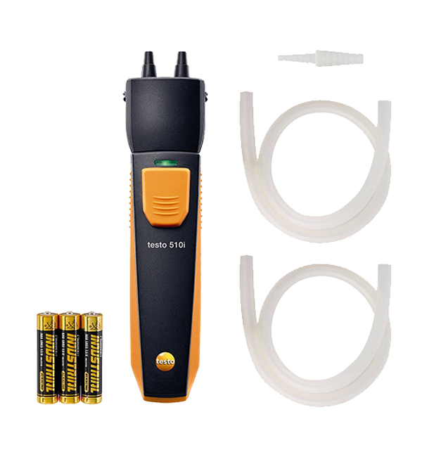 testo 510i 無線迷你差壓測量儀 ,包括帶適配器的軟管組件(直徑4毫米和5毫米)、電池以及校準(zhǔn)協(xié)議。